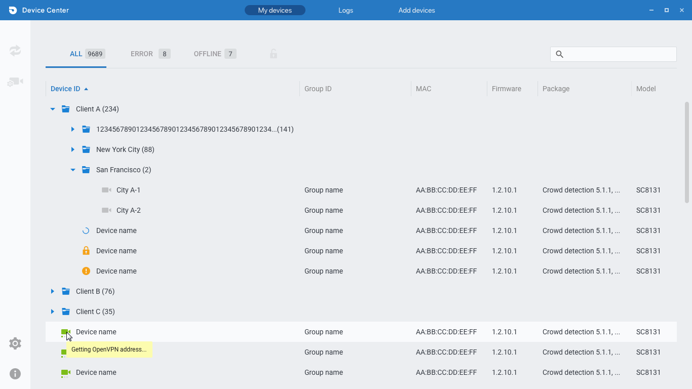 Device Center is a management tool for batch configuration of monitor devices, which can significantly save time and human resources. (I think no one wants to set up hundreds of cameras one by one) The primary functions are to adjust settings and monitor the health status of equipment without going to the site in person.